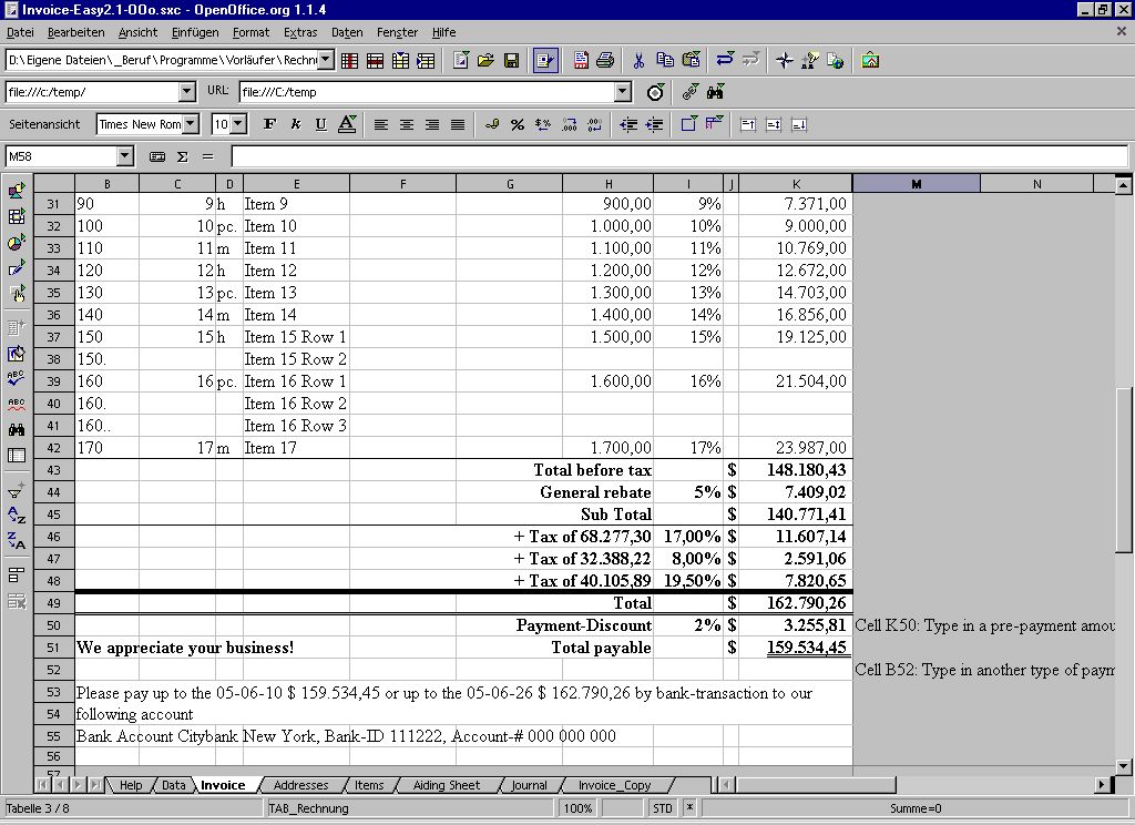 The formulas are designed to fit most types of accounting in many countries, which means, that different results are possible in a single cell, but allways according to your special data. As a supplement to this, the macros (action buttons) of the file will make the formats fit to the accounting of every single invoice. Rows and columns, which are not needed will fade out. Besides these optical effects, also every word, which isnīt needed, will be faded out. Customers, who donīt receive rebates or discounts from you, will not even see these words on the invoice, in order not to cause demands. Since everything works automatically and only the necessary data is queried in the setup, it should not bother you, if your billing doesnīt need all the functionality.