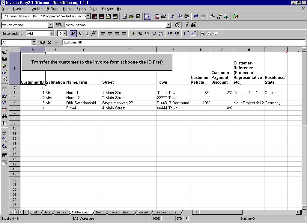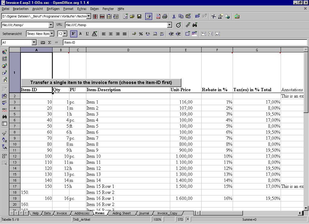 The invoices can be written by automatic data-overdraw from data sheets (addresses and items), by the use of references (simply type in customer-ID, item-# and quantities directly in the invoice), more or less by hand or by a mixture of these methods.